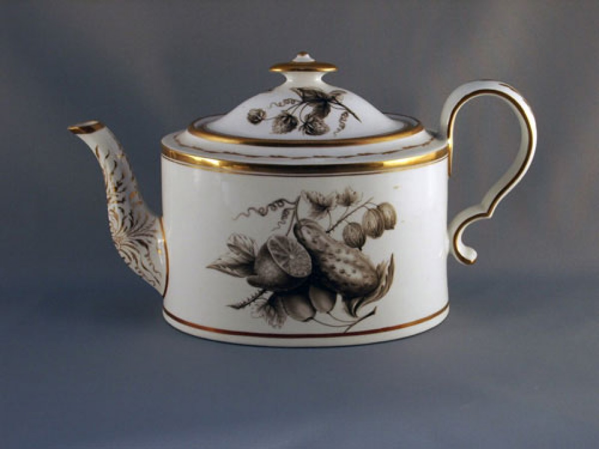 ポット、クリーマー、C&Sのトリオ4客セットです。このセットは少々謎です。この年代ですと朱色の書き文字でspodeまたは型番号、柄番号など、何かしら書かれているはずですが、まったく何も書かれていません。でもグリザイユで描かれた絵は素晴らしく、皆はじめはプリントと思ったようです。絵を描く仕事をしている私でも特にポットの絵は驚嘆致しました。素地も同時代のスポードの転写用に比べ、肌理も細かく白い綺麗な素地です。残念なことにシュガーポットを買い逃しました。いつか買い足したいものです。