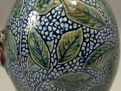 葉文の地には亀甲文が彫り込まれ、固く焼かれ、なおかつ非常に艶のある美しい作品です。(この作品は娘が購入したものなので、ゲスト作品です)