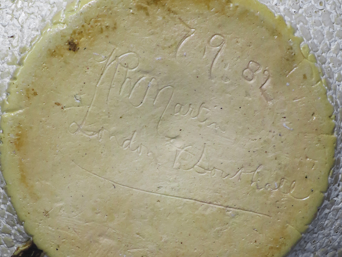 釉薬の景色は日本の陶器の梅花皮ーかいらぎ(これは萩の茶碗の高台近くに出る事が多いです)または唐津焼の蛇渇釉のように見えますが、その上に花や鳥の装飾があり、なおかつ塩釉ですので正直手法が判りません。魅力的なベースですが、一部の友人からは「かゆいかゆい!」と笑われます。確かに私もそう思いますが、魅力的な作品でもあります。