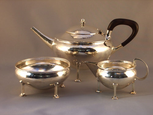 A. E. Jonse の代表作で、The Silversmiths of Birmingham and their Marks:1750-1980 の p. 183 に同型のものが出ています。UFOのような足が面白く今にも歩き出しそうな感じです。