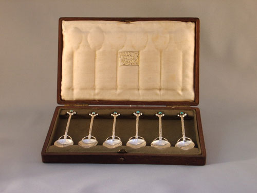 6本のトルコ石の嵌った手打ちのスプーンです。裏に Cymric の刻印もあります。オリジナルボックス入りでそのボックスが樫と思われる木製、Libertyの文字もヌーボー調の素晴らしいものです。売り手はマッキントッシュのデザインではないかといいますが、特徴から Rex Silver ではないかと私は思っています。