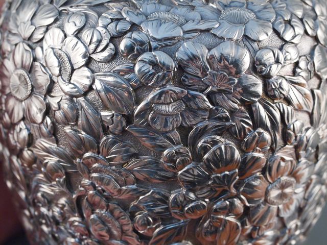 製法はさだかではありませんが、一度裏からある程度打ち出して、絞り成形してから表面を、英国のチェイシングの様にエンボスをはっきりさせ槌目で仕上げてあると思います。