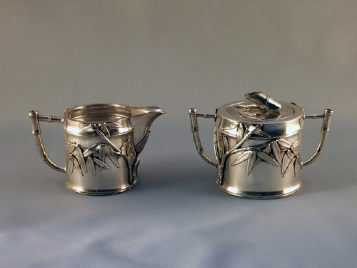 戦前の皇室の所謂「御用達」の老舗です。1958年以後はこの名称は廃止されていますが、老舗の格と品質は保たれているようです。この竹の意匠のシュガー&クリーマーはおそらく1000銀近い純度の銀で造られていると思われます。それだけ柔らかい銀ですので磨き方が難しく、このセットも間違った磨き方をされたため、磨き傷が少々ついています。製法は本体にあとから竹の意匠のものを貼りつけて完成させた物と思われます。