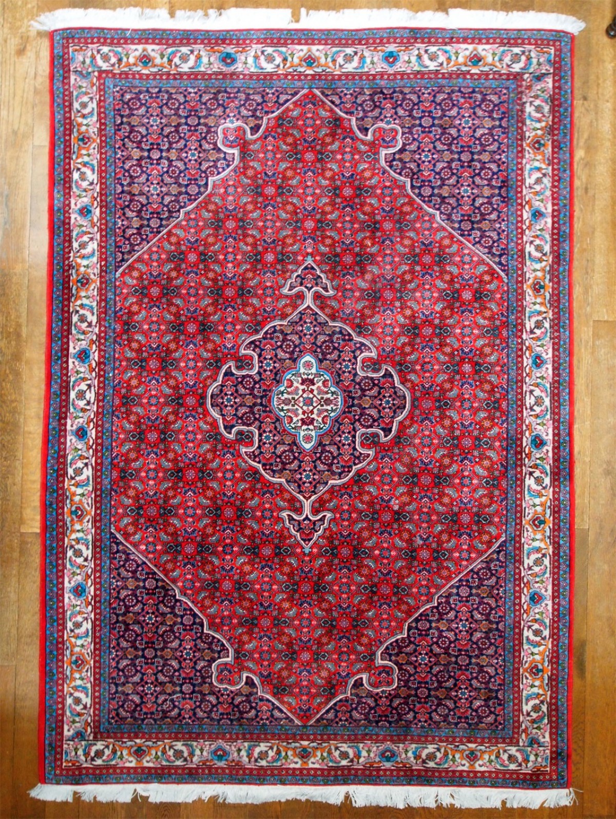 鉄の絨毯と呼ばれるビジャー産の絨毯です。表面もガシガシした感触で大変に重い絨毯なのですが、我が家のビジャーは織りが少々細かく、ウールも質が良い物を使ってあるらしくビジャーにしては柔らかいのが不満ですが、それでも居間に敷いて猫=タコの爪研ぎくつろぎ用になって貰い、酷使されています。製作年はそう古くはありませんが、我が家に来てから30年経っていますから4~50年は経ているでしょう。