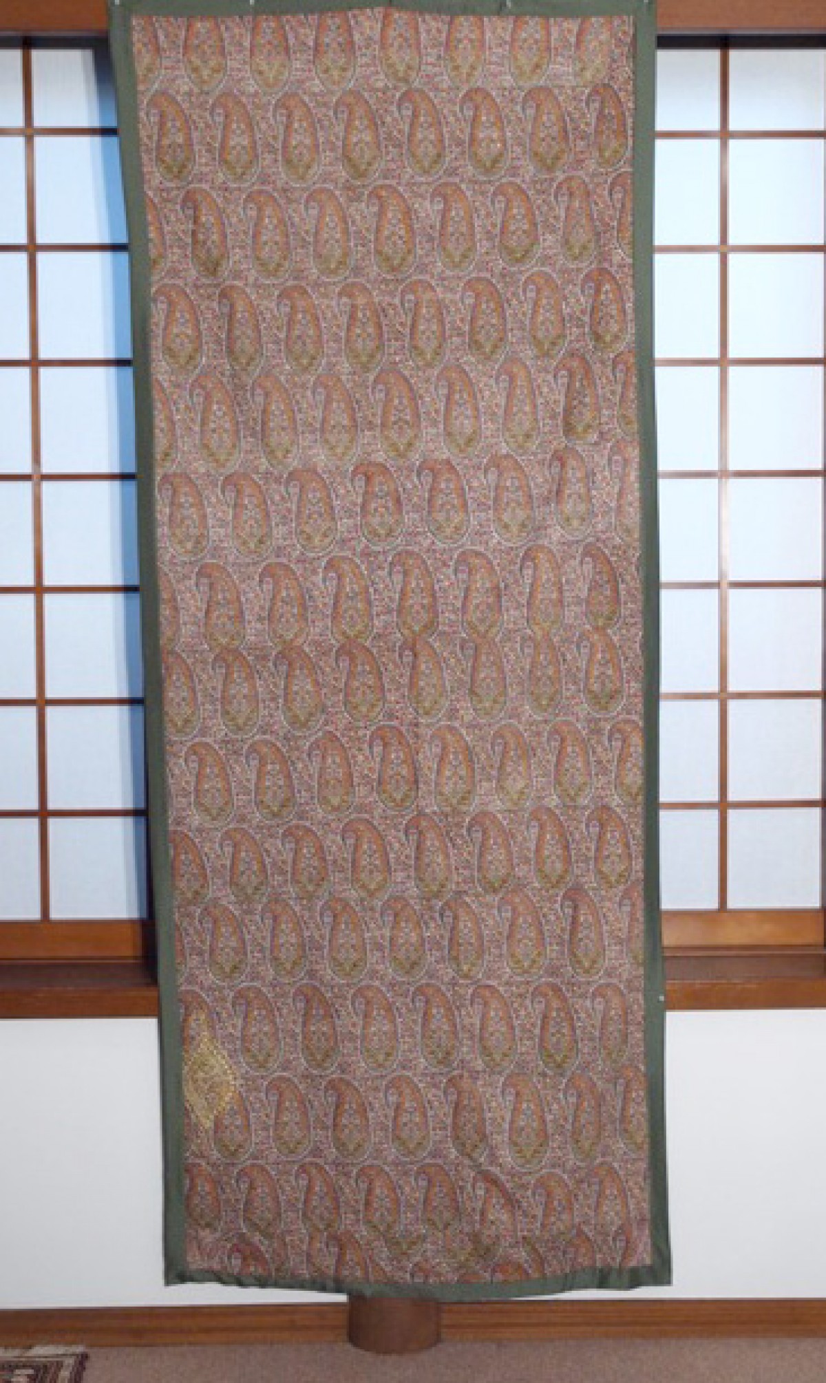 ペルシャのテルメ(TERME)と呼ばれる古い布です。主に王族、貴族、富豪などの服用として織られ、その後ほどいて1枚の布にし、ショールにされた物が多いです。この布も良く見るとあちこちを上手く接ぎ合わせて、1枚の布にしています。横にそれをショールにした人のサインと日付と思われる物が黄色の糸で刺繍されています。周りの緑の縁は敷物として使いたかった為、呉服屋さんに紬地をショールの緑に合わせた色に染めてもらい、仕立てて頂きました。考えてみたら贅沢な事をしたものです。